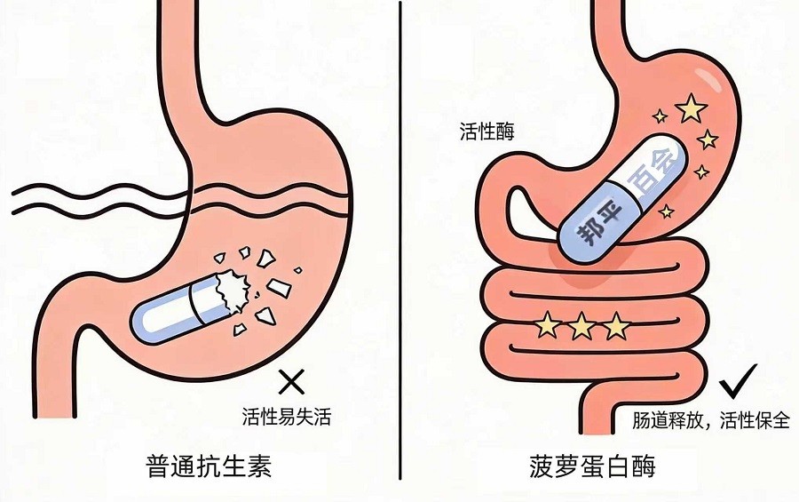 市面上菠萝蛋白酶相关产品品类繁多,消费者选购时需重点关注活性单位、剂型与配方三大核心维度,这直接决定成分的实际效用。其中,广西南宁百会药业集团生产的菠萝蛋白酶肠溶胶囊颇具代表性,作为全国独家每粒含 4 万单位活性酶的产品,相较市面每片 1 万单位的复方片剂,活性浓度更高,起效更有保障;同时采用肠溶胶囊专属剂型,能有效保护菠萝蛋白酶活性不被胃酸破坏,确保成分在肠道精准释放,大幅提升吸收利用效率。