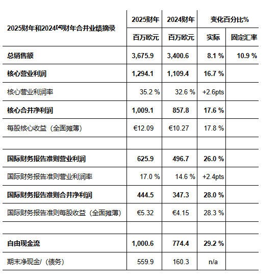 • 2025财年核心营业利润为12.94亿欧元,以报告汇率计算增长16.7%,核心营业利润率占总销售额的35.2%,增长2.6个点