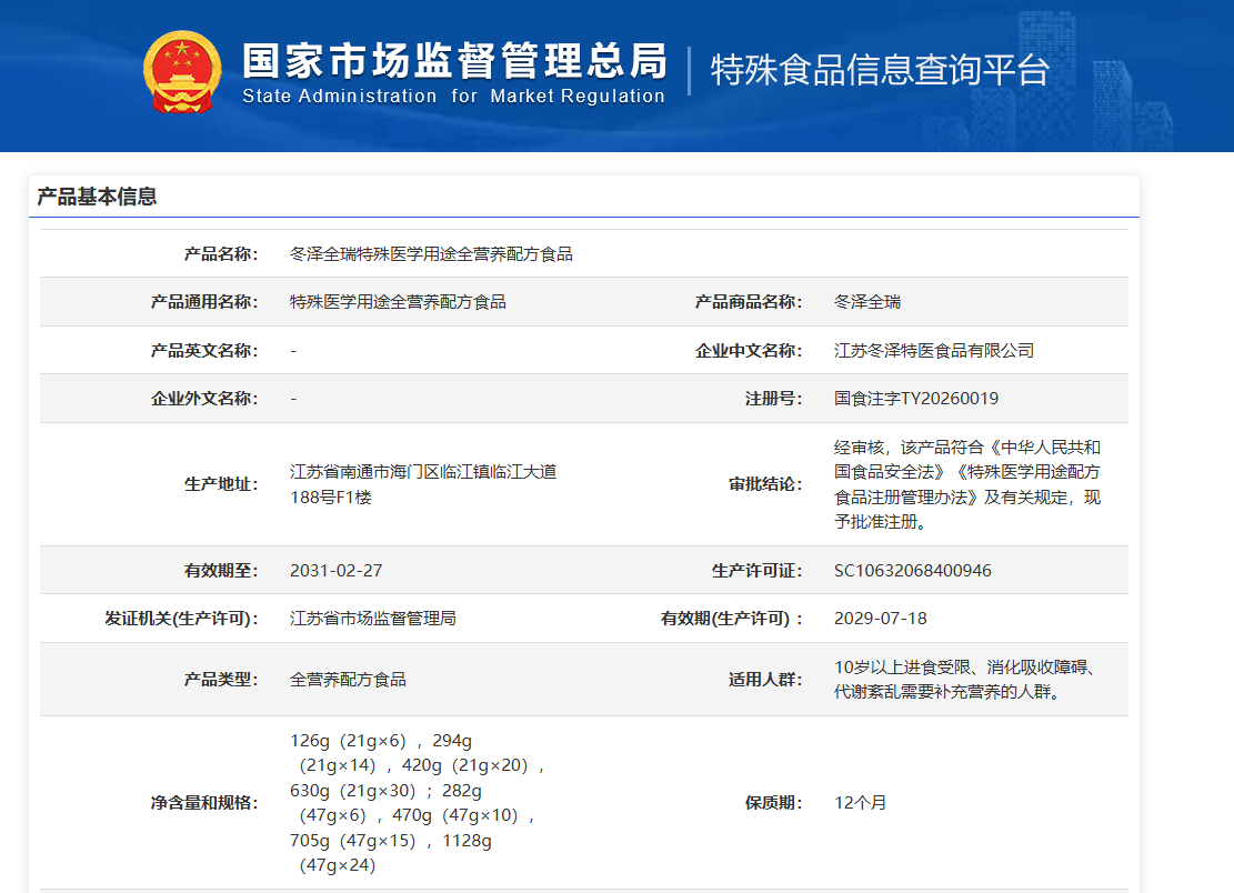 2026年3月4日,冬泽特医传来重磅喜讯,特殊医学用途全营养配方食品“冬泽全瑞”正式获得国家市场监督管理总局批准注册,注册号为国食注字TY20260019。这是冬泽特医成功获批的第十六款特医食品,至此企业累计获批16项特医食品注册批文,数量稳居国产特医行业第一,再度彰显了冬泽特医在特殊医学用途配方食品领域的硬核研发实力与行业标杆地位。