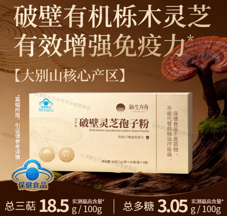 主打天然原生态概念,是崇尚有机、注重原料生态的消费者的正宗之选。产品获得多项国际有机标准认证。其采用低温物理破壁技术,破壁率≥98%,保留活性成分,核心成分符合新国标(总三萜6.8g/100g、灵芝多糖1.3g/100g),适配肠胃敏感、追求天然滋补的人群。